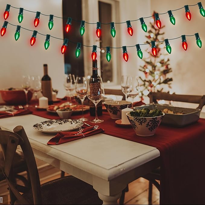 - 🌟 Versatile Application: Red green christmas decorations lights glow a warm white lights, retro Christmas light string is dimmable, lights dimming requires a dimmer. c7 led christmas lights can be used both indoor and outdoor, such as the bedroom, bar, window, Christmas tree, party, wedding, window, holidays, festivals, shows, restaurants, hotels, shopping centers, patio, or porch, pathway, roofline decorations and lightings