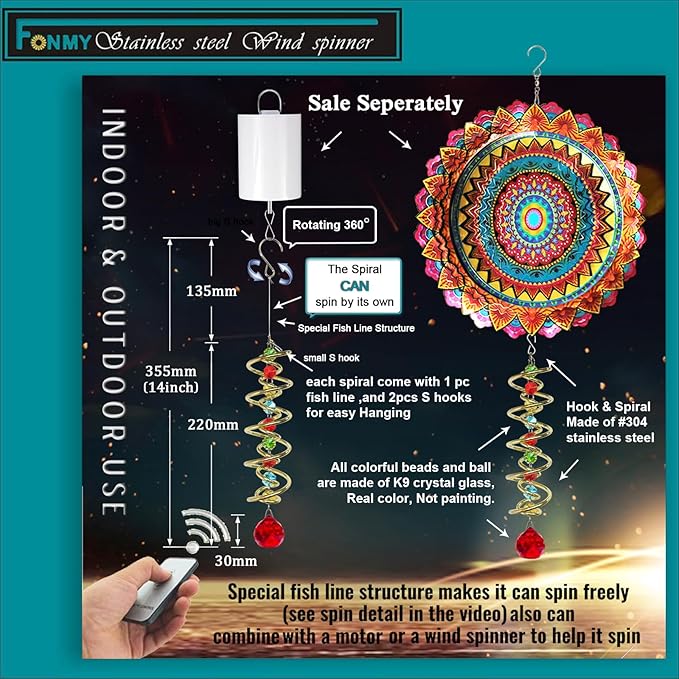 - 【PREMIUM CRYSTAL SUNCATCHER】The spiral with crystal is a special sun catcher rainbow maker, it’s Super Sparkly under sunshine. You can also add a motor(not include) to let the spiral to spin ,while spiral tail rotating (it can’t spin by itself.), the crystal ball seems to move up and down like floating and dancing in air, presents the magical visual illusion.
