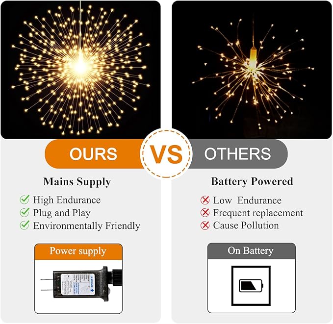 - 【Long-Lasting & Green】Our plug-in design ensures continuous brightness and outstanding lighting effects with minimal energy consumption. Enjoy the remarkable durability and sustainability of our firework lights, which are powered directly from the mains. With a cool touch and leak-free operation, they provide a safe lighting solution. No more worries about wet weather or battery box damage from short circuits. Light up your space with confidence.