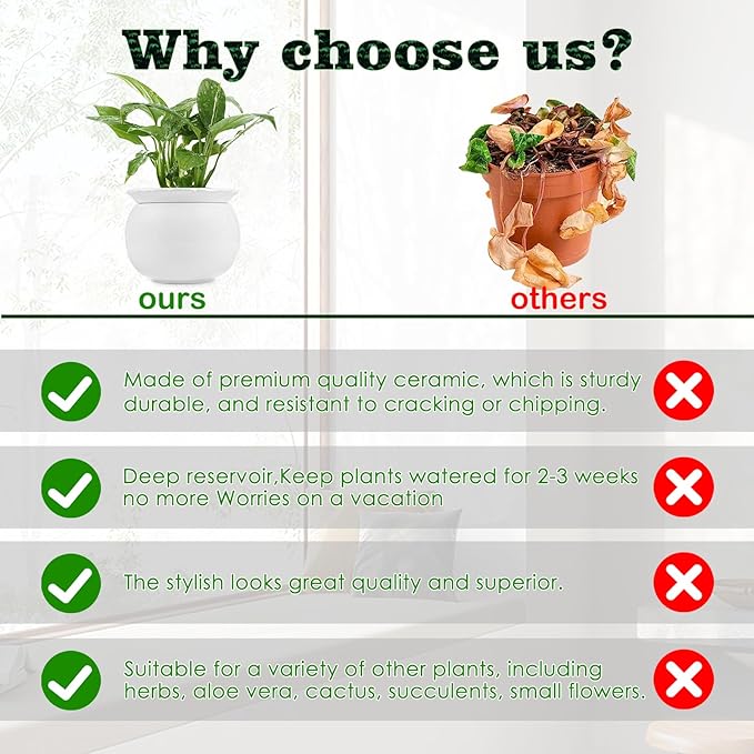 - Stylish and Versatile: Self watering pots for indoor plants complement any room decor and can be used for an array of plants that need consistent root moisture to thrive. African Violets, Baby's Tears, Pothos, Fittonia, Calathea and herbs like Parsley, Rosemary and Mint will benefit from our self-watering ceramic planter pots