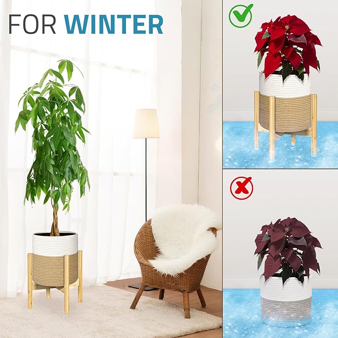- 【Plant Basket with Stand】Natural jute woven rope with coiling sewn method to create a plant basket that is stiff enough to hold its shape.100% bamboo stand adds a natural focal point and guarantees it is clean and recyclable.