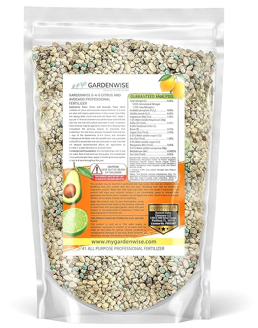 - đ Grows Delicious Fruits: With a balance of 6% nitrogen, 4% phosphorus and 6% potassium, Gardenwiseâs 6-4-6 Citrus and Avocado Professional Fertilizer nourishes your indoor and outdoor trees with a high-quality blend of nutrients. Youâll love the incredible flavors!