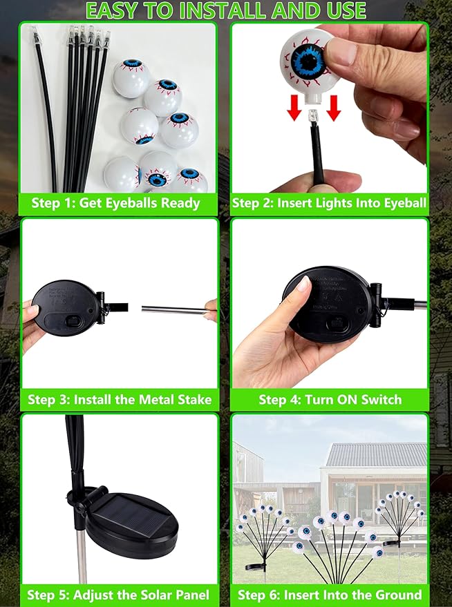 - 【Solar Halloween Lights Kits】Value 4-Piece Set, each include 8 eyeballs, total of 32 horror eyeball LED lights. Emits an eerie green glow that scares and envies your neighbors. One-of-a-kind Halloween outdoor lawn path decorations.