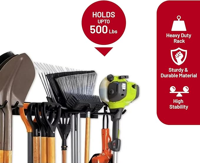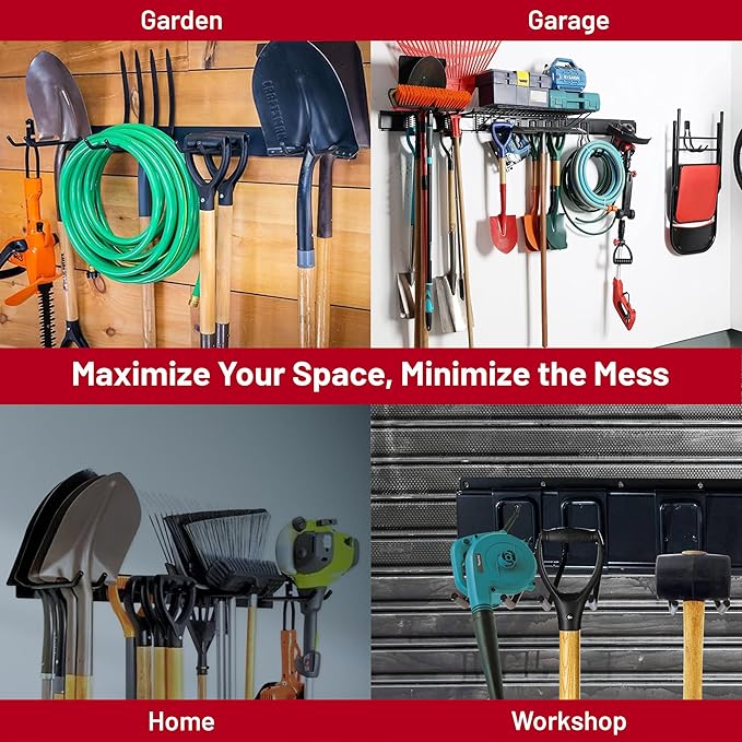 - π©ππ₯π¦ππ§πππ π¨π¦πππ - This utility rack is not just for garden tools; itβs ideal for organizing a variety of items such as sports equipment, skiing gear, hardware, and more. Its adaptable design makes it a versatile addition to any garage, shed, or workshop. Equipped with hooks for brooms and mops, this tool storage rack doubles as an efficient garage broom holder wall mount.