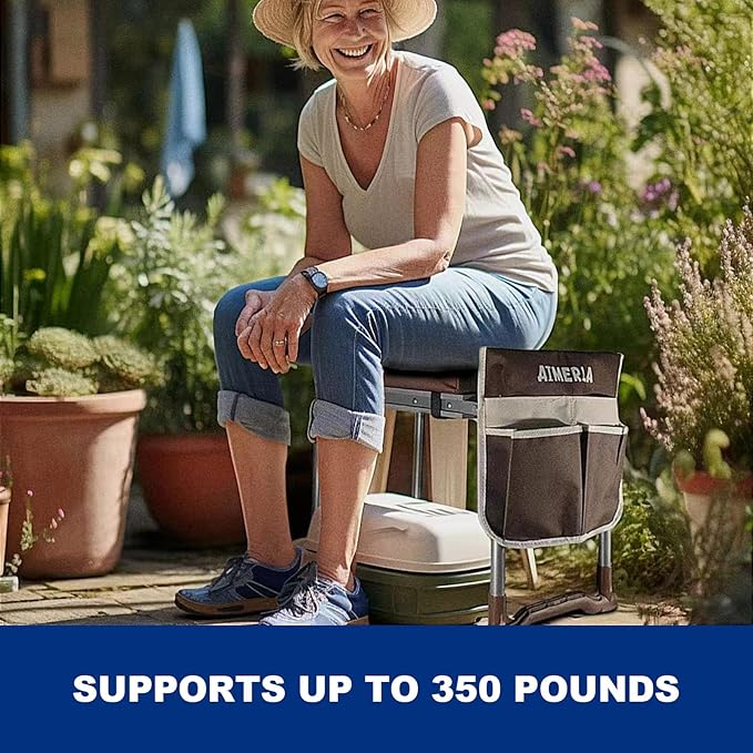 - Unbreakable, Foldable, and Ready-to-Go! Our garden kneeler is as sturdy as your grandma's oak tree swing, supporting up to 350 pounds with ease.. It's ready-to-use, no assembly required – just unfold, and voilà! And, guess what? This kneeler is complete with a snap-lock that ensures it stays shut when it's flipped and used as a garden stool. Enjoy grab and go convenience with this garden kneeler that weighs just over 7 lbs. Aimerla Kneeler: making gardening chic and a breeze
