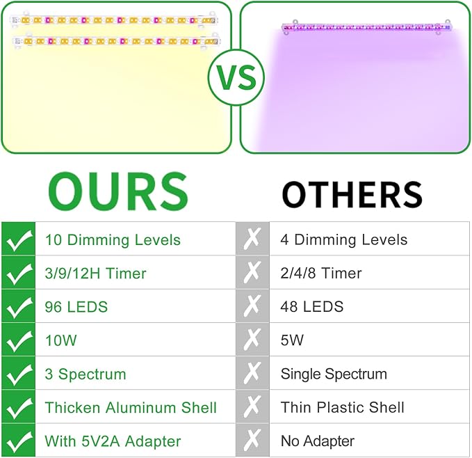 - 【Material Safety & Easy Installation】All aluminum material, strong corrosion resistance, hard to melt. The grow light pack comes with screws, ties, double-sided tapes and magnets to provide four mounting options. Compact design fits for various fixtures and surfaces. The power cord is 96 inches long for easy using in office,indoor,plant shelf,greenhouse etc.