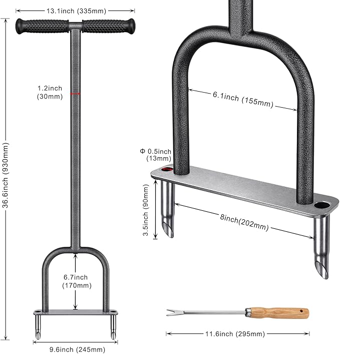- Come with 12‘’ Weeder Handle Tool: Use this lawn coring aerator for other gardening tasks, Lawn aerators come with a 12’’ hand tool that you could use to clean the aerator. It can also be used for transplanting seedlings and weeding, which is very convenient.