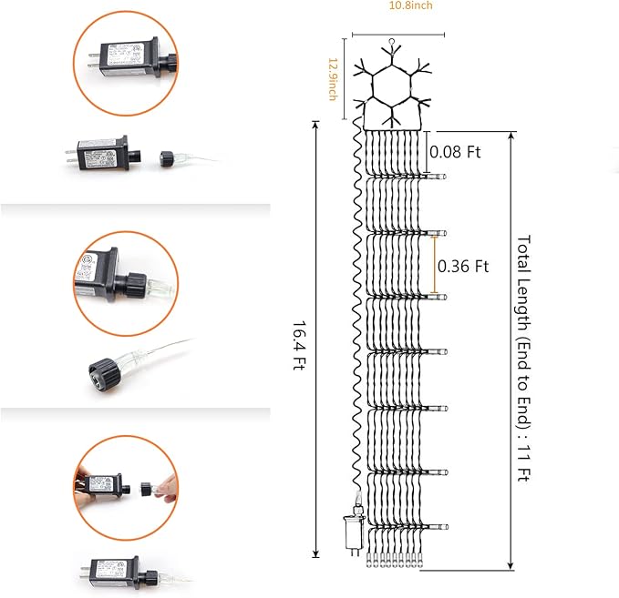 - ⭐【Safe Use&Easy to Install】Come with a 30V low-voltage plug with UL certification to ensure safe use. Plug and unplug the power directly to turn on and off. Easily hang from the tree, roof, facade, or eaves as a patio decoration, and then drape the 9 strings of lights on the ground for a unique Christmas atmosphere.