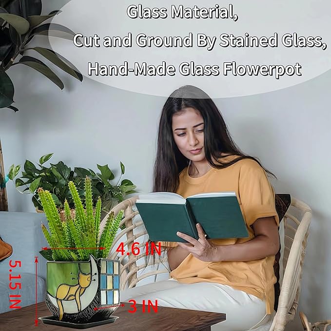 - This moon sleeping cat flower pot is made of real stained glass, and each piece of glass is cut and ground by hand by craftsmen; the pursuit of perfect craftsmanship creates this colorful glass flower pot craft
