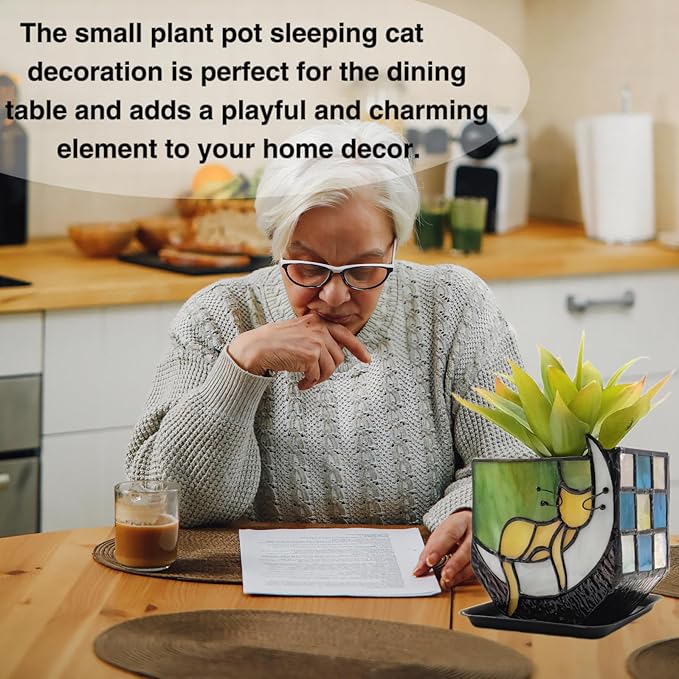 - Looking for a unique and beautiful way to display your plants ;Tiffany Style Stained Glass Cute Moon Sleeping Cat Flower Pot ; Made with a corrosion resistant pure copper frame, these pots are not only functional but also beautiful. Each flower pot is handcrafted and can be used for planting, dried flower arrangement, candle holder, pen or cosmetic brush holder and so on. Perfect for decorating your dining table, living room, or anywhere else you want to add whimsy and charm