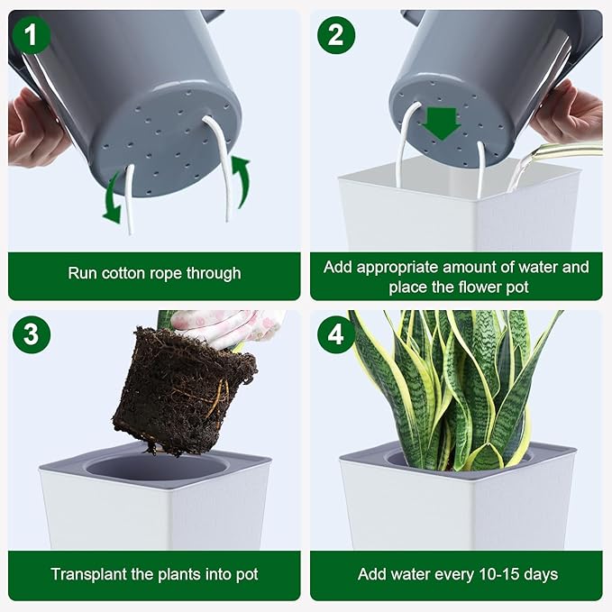 - TIME-SAVING AUTOMATIC WATERING SYSTEM - Each self-watering plant pot contains an outer pot that acts as a water reservoir and an inner pot that acts as a plant growth pot. The planter has a high-quality cotton rope that acts as a wick to draw water from the reservoir into the inner planter where the plants sit. The plant then absorbs the appropriate amount of water, which provides nutrients to the plant. When you travel, you never have to worry about plants again. Super time saver for your gardening work.