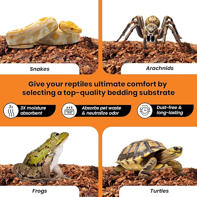 - 🥥Reptile & Amphibian Bedding Substrate: Upgrade your pet's home with our top-notch reptile bedding substrate. It absorbs moisture three times better than regular types, keeping your pet's home dry and comfortable. It has excellent capacity to absorb waste & eliminate odors. Perfect for all types of reptiles, arachnids & scorpions