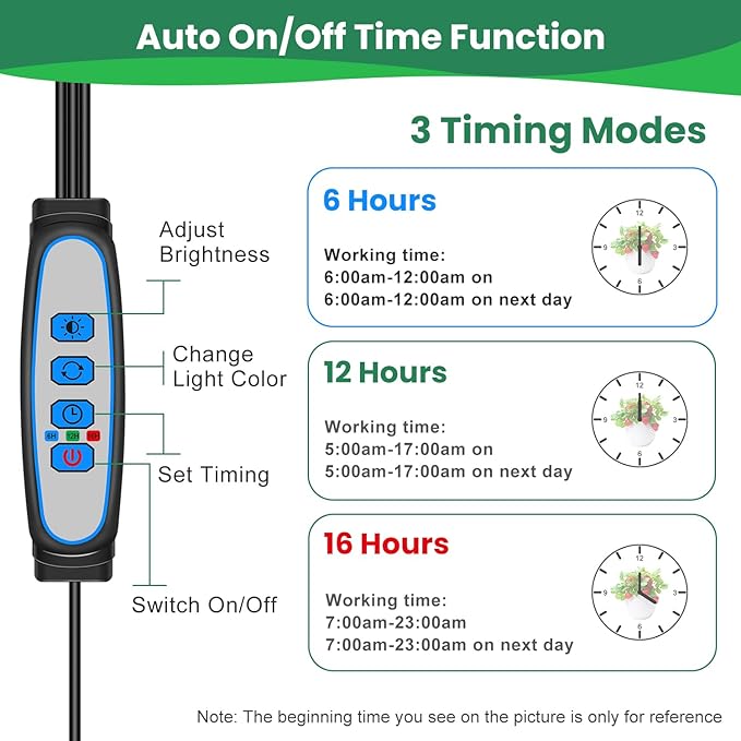 - [6 12 16H Timer] Most of the plant lights with built-in controllers on the market do not exceed the timed 12H, and ours has been upgraded to exceed 12H, which is more friendly to light-loving plants, so that the plants grow better. Set the timing time(6H 12H 16H), you don’t need to manually turn on and off the grow light. The grow light will convenient to takes good care of your plants when you go out to work or on vacation