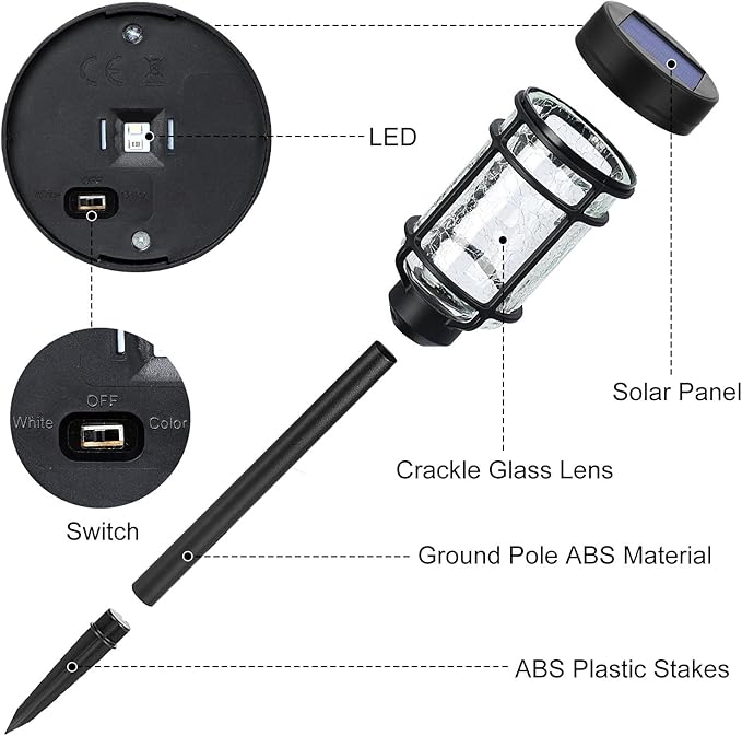 Solar Pathway Lights 6 Pack, Color Changing+Warm White LED Solar Lights Outdoor, Waterproof Solar Crackle Glass Stake Lights for Garden Path Walkway Backyard Lawn Landscape Decoration