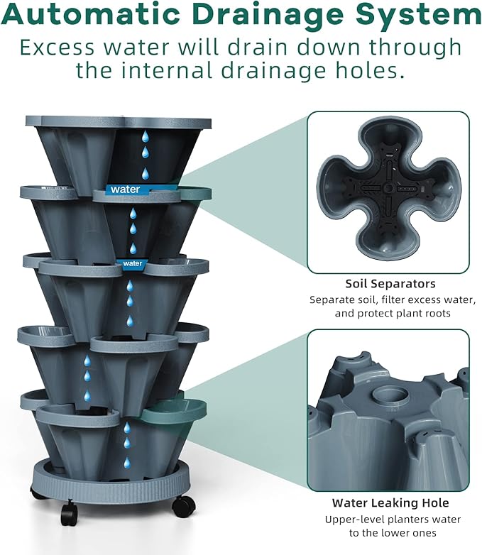 - Flow Design - The water filtration system from top to bottom can save water and retain moisture but prevents overwatering or root rot. 7 filters are placed on each level to keep the soil from going through the big drainage holes, it also helps retain water in each planter level.