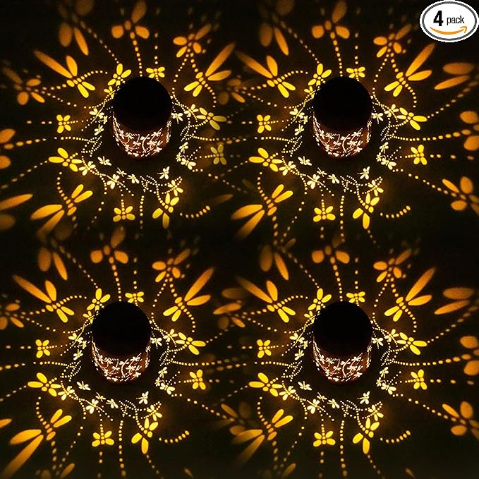 - Gorgeous & imaginative Garden Decor - Fusion the retro gold, copper of exteriors and irregular pattern inside, at darkness, the solar lantern casting a bright, warm light with dragonfly patterns, which looks like they are real and flying