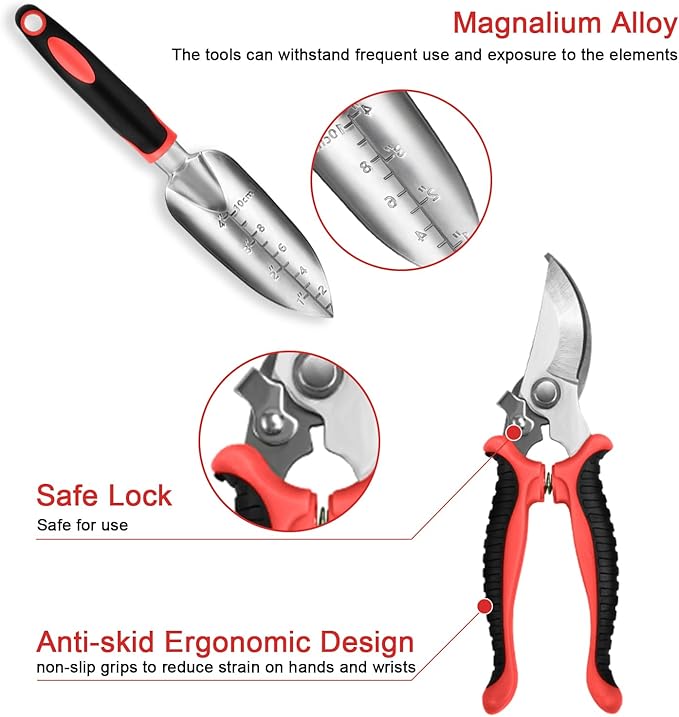 - ππππ πππππππ ππππππ πππππ: Our gardening tools are crafted from high-quality aluminum alloy, which offers an ideal balance of durability and lightweight design. This material provides superior hardness and rust resistance, making our tools long-lasting and reliable.With our high-quality gardening tools, you can be sure that you're investing in a set that will stand the test of time.