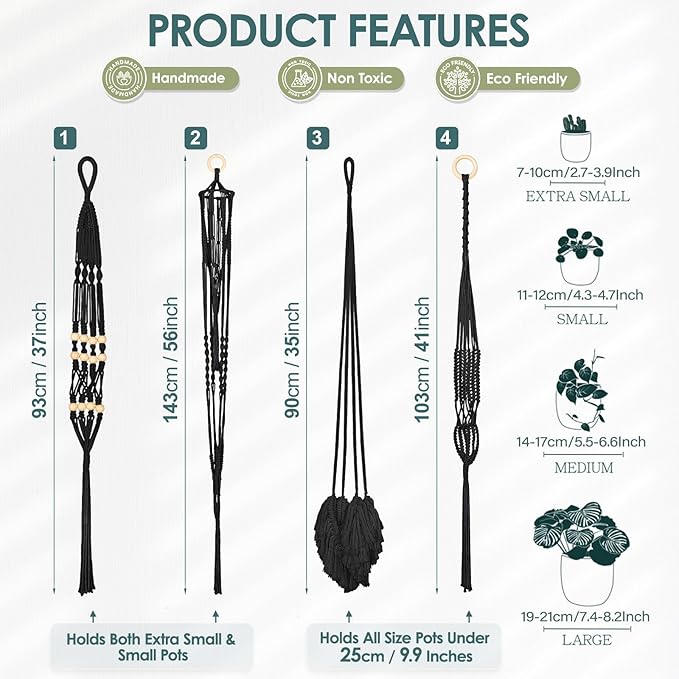 - EASY TO INSTALL & VERSATILE: No assembly required, the boho hanger set comes ready to use. For using, you can just hang it on a sealing hook, wall hook, curtain rod or anywhere you would like it to be. Double tier hanger and wooden bead hanger only holds small pots under 4" in diameter; Fluffy tassel hanger and classic hanger can holds pot or bowl size under 9.9 inches in diameter. Please check the pot size before you make a purchase.