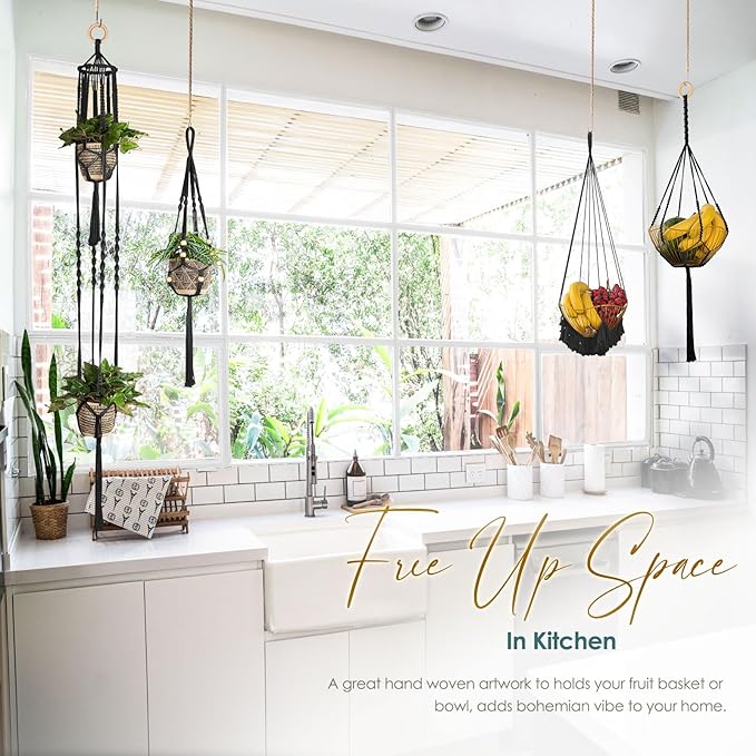 - FREE UP CORNER SPACE: Macrame plant hangers are the perfect small space solution because they can be hung on the wall or from the ceiling, freeing up shelf space for other things. Also, A great hand woven artwork to adds bohemian vibes to your home, kitchen, nursery, indoor garden, bedroom, living room, dorm, offices, studio and so on, brings a unique decorative piece to style your space and great way to show your plants, create your own urban jungle.