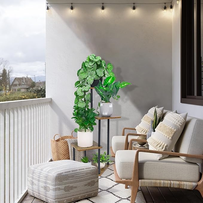 - 【Elegant Decoration & Space Saver】Minimalist style, wood grain board with metal frame, Vintage Plants Stands Rack match well with your home decor in living room, corner, balcony, hallway, garden, patios etc.