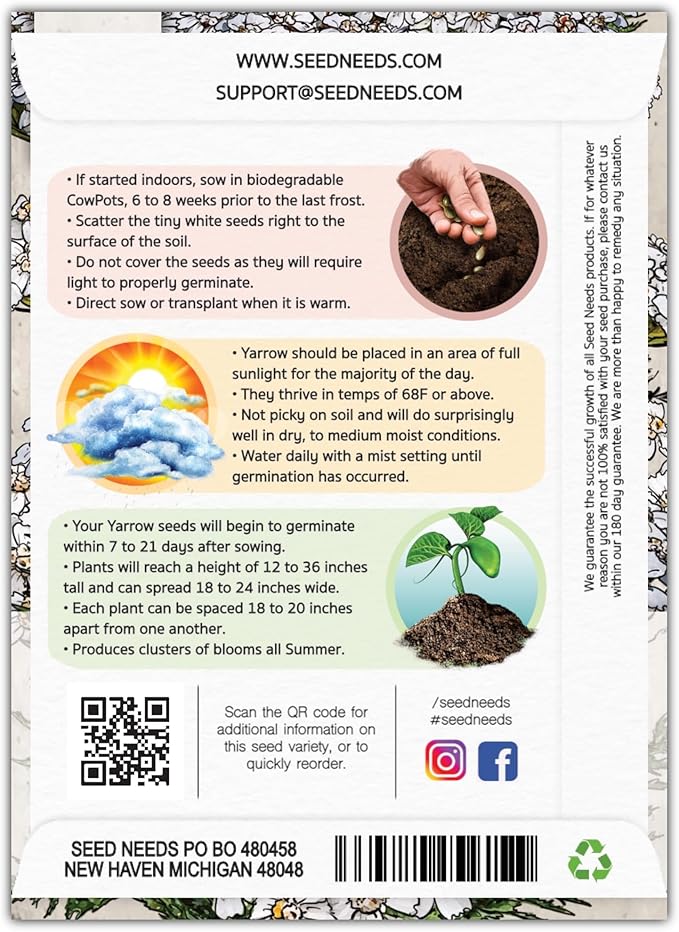 Seed Needs, White Yarrow Seeds - 500 Heirloom Seeds for Planting Achillea millefolium - Perennial Host Plant to Attract Monarch Butterflies & Other Pollinators (2 Packs)