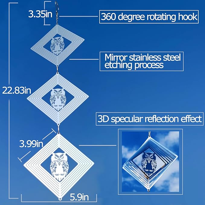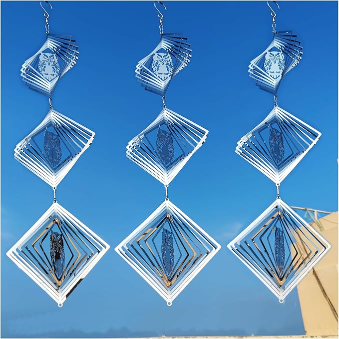 - These are 9 swivel hook and 9 square discs owl bird scare of very shiny reflective matel wind spinners can rotate easily in the breeze, protect your garden, farm, and lawn by creating a bright flash that scares away birds.