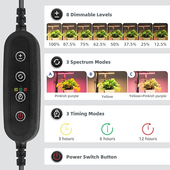 - Time It Right: With a built-in timer offering 3/6/12 hours and will automatically turn on and off at the same time the next day, no need to unplug/re-plug, you can effortlessly manage your plant's lighting schedule