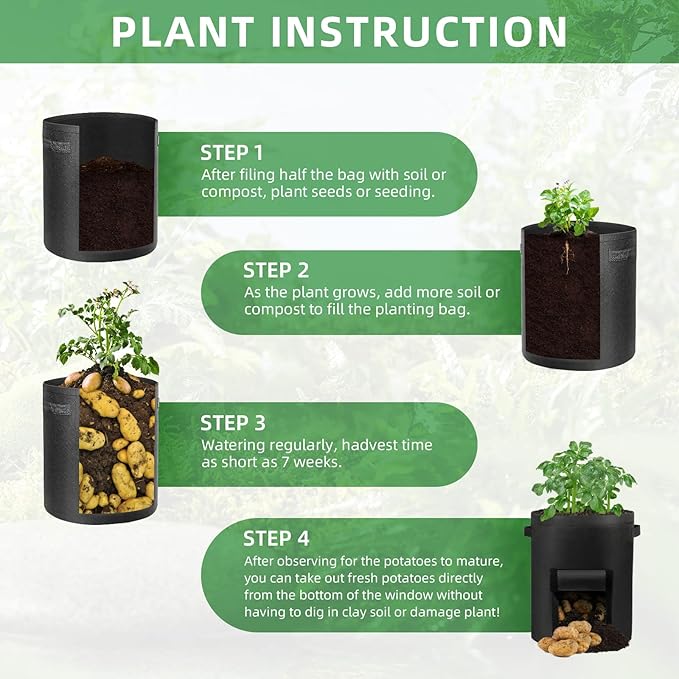 - 【Wide Application】The 7 Gallon potato growing bags can be used to grow potatoes, tomatoes, carrots, garlic, onions, beans, apple trees, papaya trees, guava trees, flowers, and so on. You can plant different plants according to your personal preferences. They can be folded and washable, and easy to clean for yearly reuse.