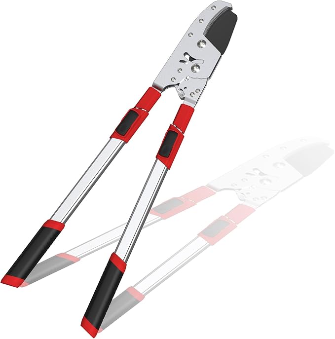 - [TELESCOPING ALUMINUM ALLOY HANDLES] The lopper's extendable handles, adjustable from 28 to 41 inches with 6 pin-locked positions, and rubber grips offer one-touch adjustability for extended reach. This feature enables users to trim higher branches without needing a ladder, adding versatility to the tool. The telescopic design enhances your cutting range and ensures convenient storage when not in use.