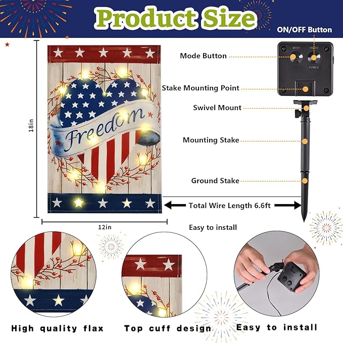 - Various Styles: These outside holiday garden flags are designed with 12 styles and different holiday themes, such as Valentine's Day, Christmas, Halloween, Easter, 4th of July, St. Patrick's Day, etc. Each lighted garden flags has 8 lighting modes meeting your decoration needs for all seasons.(Note: the flagpole not included.)