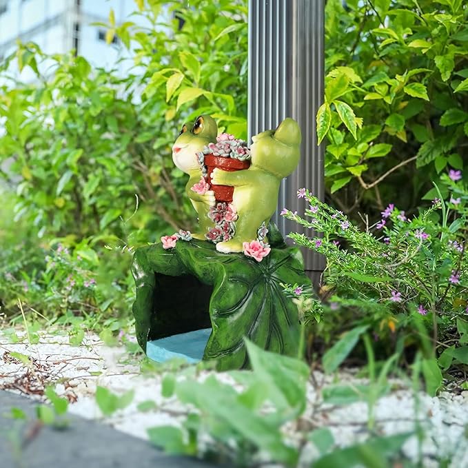 - PERFECT GIFT IDEAL: Give this solar garden frog statue away as a funny novelty Birthday, Christmas gift or housewarming gifts and you would be rest assure it will be appreciated. This unique rain gutter spouts will immediately enhance your garden decor and friendly to your garden and do no pollution.