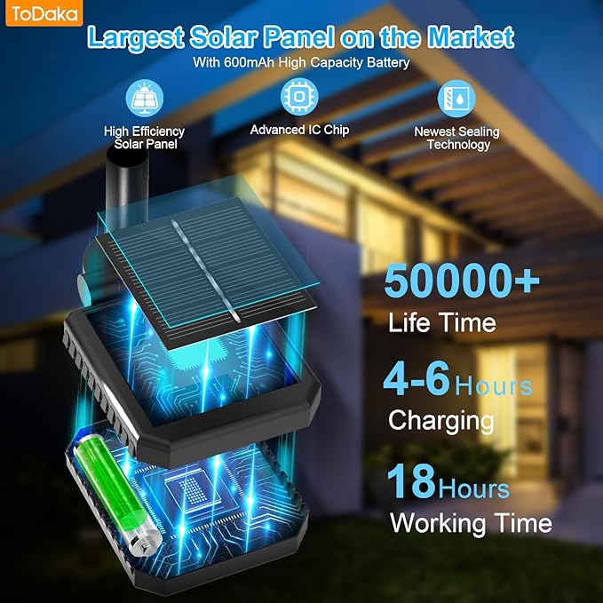 - 【Quicker Charging & Longer Lasting】- Garden lights featuring monocrystalline silicon solar panel with the highest photoelectric conversion efficiency (up to 26%), they are faster charging than the ordinary solar lights for outside. Built-in 600mAh Ni-MH battery, our solar lights produce brighter yard decor for up to 18 hours after just 4-6 hours charging.