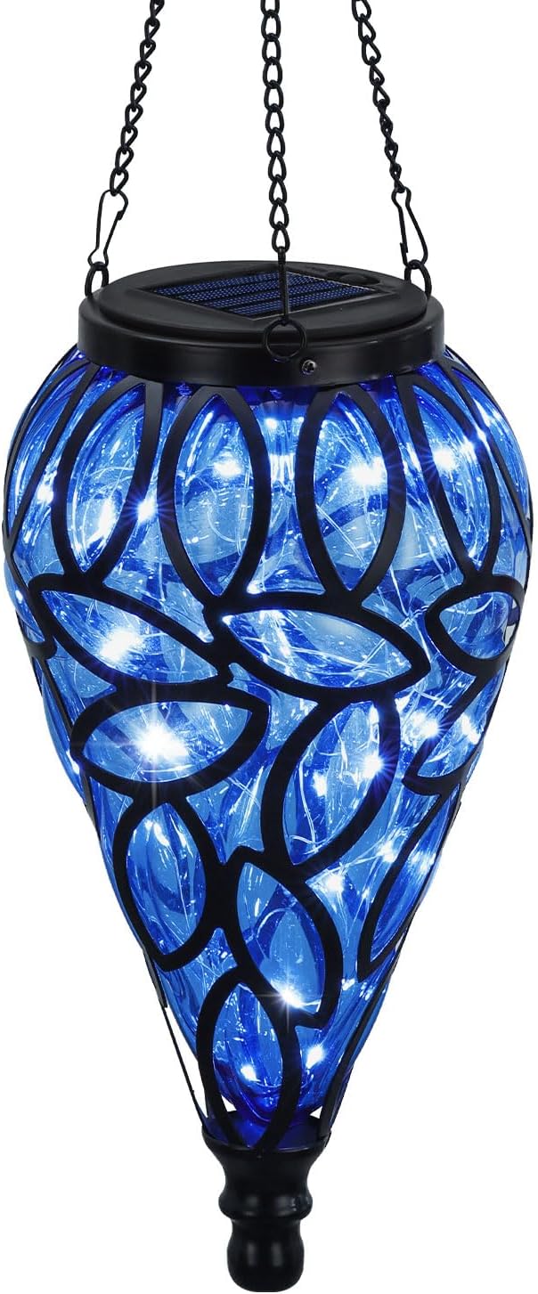- Unique Design: Translucent plastic ceiling lantern features an inverted teardrop shape surrounded by a leaf frame metal cage with a plastic lampshade in blue. The solar hanging lantern will sparkle in the sunshine during the day.