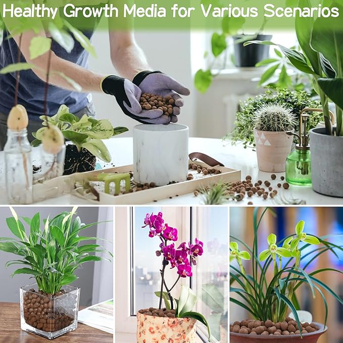 - 🎍【Perfect Medium for Plant Growth】: Expanded clay pebbles can be mixed with coco coir potting soil and peat pellet soil as a growing medium to improve air permeability and water retention. Which can be used as a top-layer medium to reduce water evaporation and prevent dirt from splashing when watering; can be used as a flowerpot bottom medium to avoid the root rot and lock nutrients for roots system.