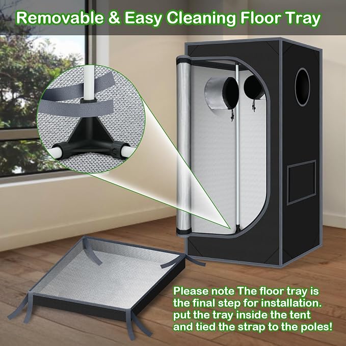 - Upgrade Design --- UPGRADED CONNECTOR--Durable PA Material Adopted, Anti-rust Reinforced Design, Adjustable Tightness According to The Pole, Hold Poles Tightly for Firmed Support. Multiple vents to accommodate fans and filter; ducting rectangle window with mesh to keep dust and insects out; Removable mylar floor tray easy to clean.