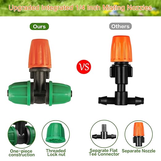 - 【PACKAGE LIST】It comes with 18pcs couplings,15pcs tees,12pcs end caps,10pcs elbows,5pcs cross connectors,and 5pcs misters nozzles. The barb design is for a secure leak-proof connection and the twist lock adds extra hold to the tubing for a secure connection.