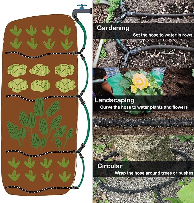 - Save Water: The soaker hose has tiny perforations that allow water to seep into the ground, reducing water usage by up to 70%, allowing plants to get the moisture they need, promoting healthier growth and a lush garden.