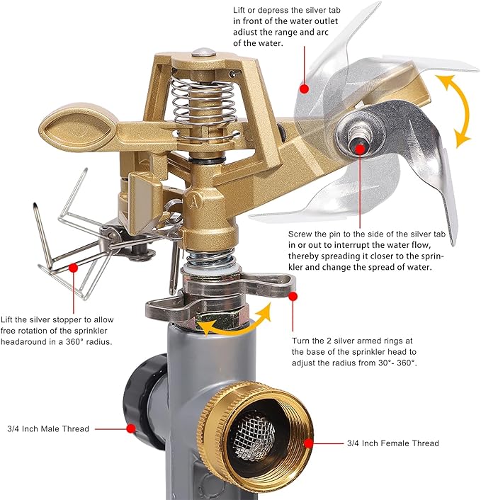 - METAL IMPACT SPRINKLER WITH SPIKE: Heavy duty lawn impact sprinkler head with step spike for yard, lawn and grass Irrigation. The lawn sprinkler can be adjusted from full circles of 360 degrees to partial circle patterns that turn 20 degrees to 340 degrees. Adjust the spray range and radian of water to make the irrigation in the garden fun