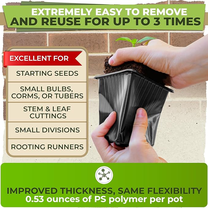 - Wide-use starter pots for planting seeds: Whether you're creating a lush indoor oasis or transforming your outdoor space into a botanical haven, our 4 inch square nursery pots are your go-to choice. Ideal for cultivating a diverse range of plants, these seedling starter pots are perfect for starting flowering plants, germinate seeds, or sprouting seeds