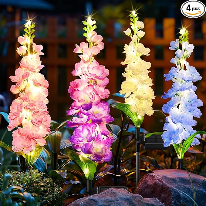 - 【Upgraded Solar Flower Lights Outdoor & 36 Bright LED Beads】The set features 4 solar delphinium flower lights in blue, pink, off-white, and purple, boasting realistic solar flowers. Equipped with sturdy garden stakes, solar lights outdoor are resistant to tilting or being blown over. Each solar lights outdoor has 9 LED beads; 4 pack solar flower lights outdoor totally have 36 LED beads. Our solar flowers outdoor waterproof are brighter than ordinary small LED beads, which make your garden more bright and attractive