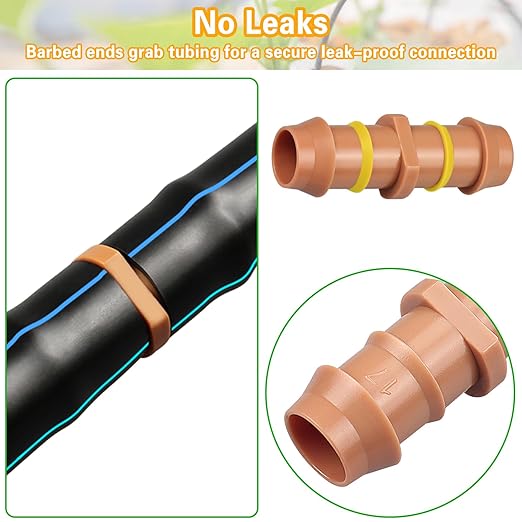 - 【EASY TO INSTALL】It is easy to install without any glue, tools or clamps. Directly insert this barbed connectors at the ends of the 1/2 drip irrigation tube, the barbed ends can grab 1/2" tubing tightly for a secure leak-proof connection.