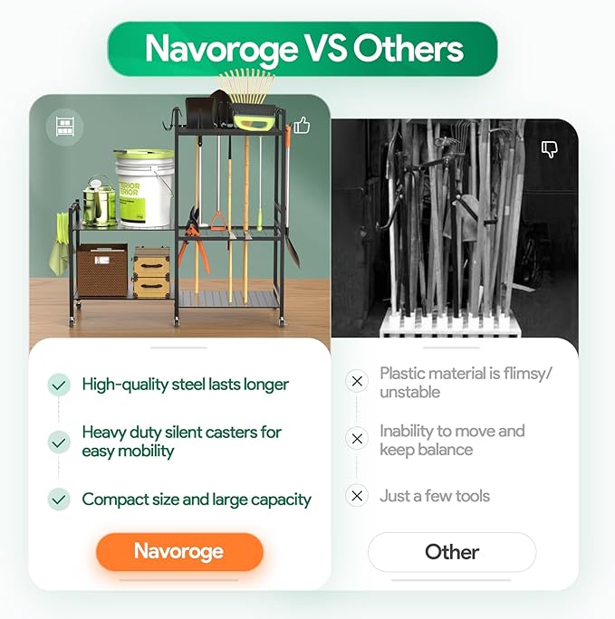 - 🔨【Large Capacity Garage Organizer】: The overall length, width and height are: 33.5" x 11.8" x 32.5". Navoroge garden tool holder can hold up to 40 tools in total. Unique storage holes are designed to hold multiple kinds and sizes of tools, perfect for gardening and lawn tools, as well as cleaning equipment.The garage organizer also comes with two additional metal platforms that can be used to hold heavy tools such as power tools, hoses, and more.