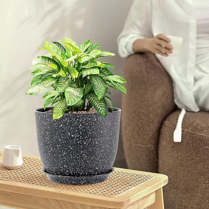 Plant Pots 10/9/8 inch, Set of 3 Modern Decorative Plastic Planters with Drainage Holes and Saucers for Garden House Plants, Flower Pots for Indoor Outdoor Plants, Speckled Black