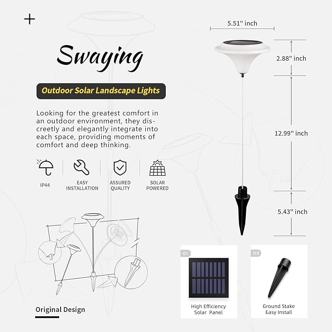 - 【Unique Design & Swaying in the Wind】Our solar garden lights feature an exquisite design that sways gently in the wind, adding a dynamic touch to your garden décor. They emit a soft, warm glow, perfect for garden, yard, or pathway decorations, creating a cozy atmosphere. These solar swaying garden lights are not just lighting fixtures; they are a statement in style and ambiance, inviting tranquility and charm into your outdoor spaces.