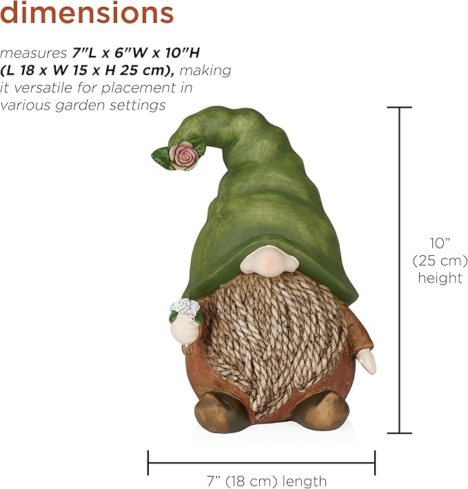 - PERFECT DIMENSIONS: With measurements of 7"L x 6"W x 10"H, this gnome statuary is a compact yet eye-catching feature for your outdoor space