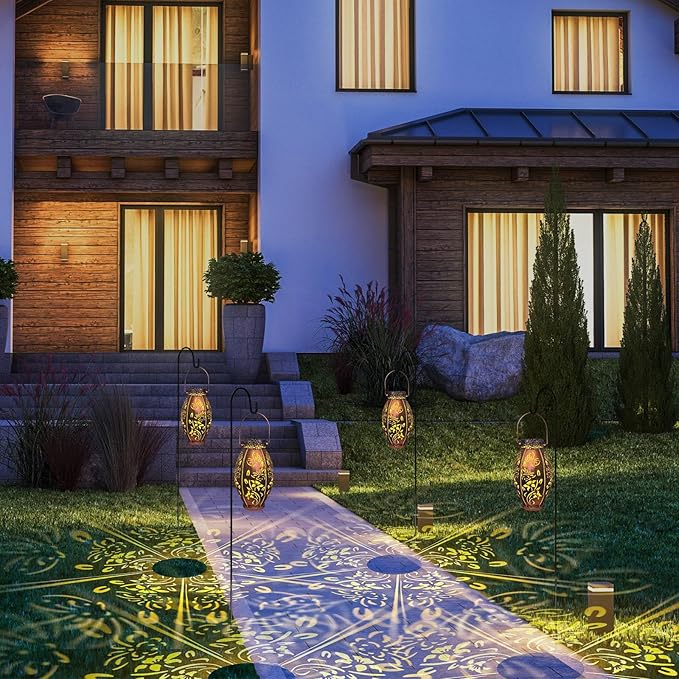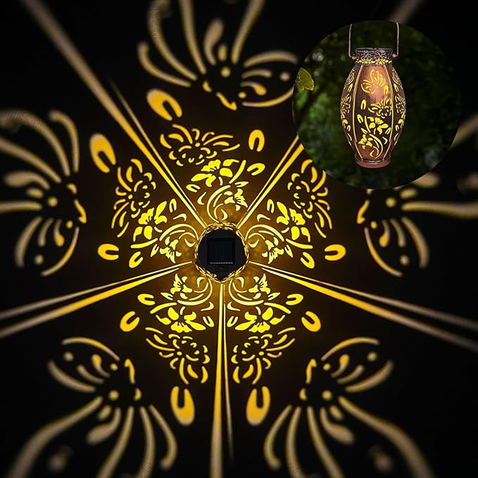 - 【Gorgeous Design/2pack Lanterns】-- Our pearlstar outdoor solar lanterns feature a vintage copper design with exquisite hollow patterns that emit a soft golden light at night, creating dynamic and beautiful patterns. They're a gorgeous and unique addition to any outdoor garden or yard.
