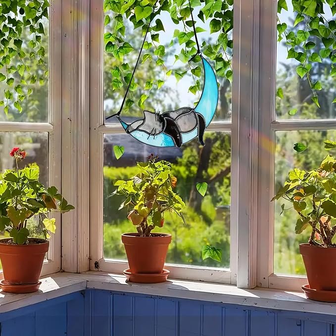 - Exquisite Craftsmanship: Each piece of our handcrafted stained glass hanging art is meticulously created with attention to detail, showcasing a stunning black cat peacefully sleeping on a crescent moon