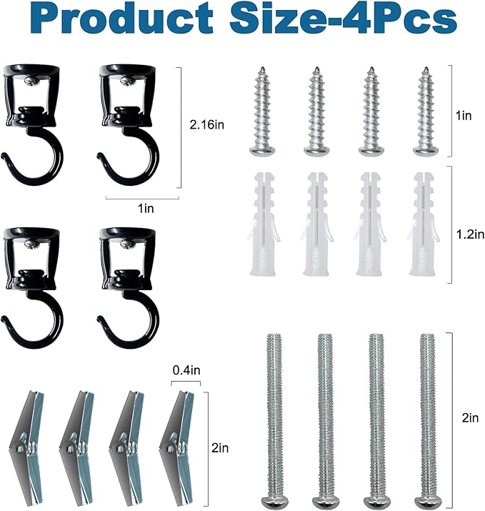 - EASY INSTALLATION: we prepare tools for different installation, the pointed screws is suitable for solid wall, long bolts and toggle wings fit for plaster and hollow walls, both of them have strong load. Each set contains multiple accessories, 4 sets in total, providing ample ceiling hooks to meet your needs.