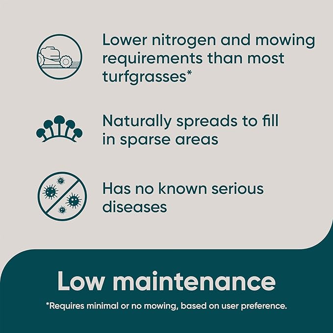 - Our seed grows low to the ground and requires less maintenance than a turfgrass lawn (requires minimal or no mowing, based on preference)