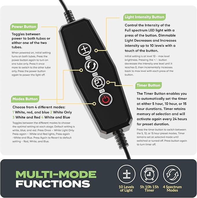 - VERSATILE CONTROL: POWER, INTENSITY, TIMER - The Power button toggles between both tubes or individual tubes. The Dimmer button adjusts Full Spectrum LED light intensity across 10 levels. The Timer button sets durations of 5, 10, or 15 hours, retaining memory for daily activation.